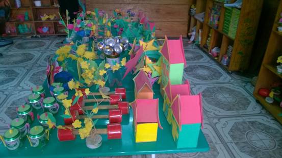 Với những nguyên vật liệu sẵn có ở địa phương mình như chai, lọ, tre nứa với những đôi bàn tay mềm mại dẻo dai của các cô giáo đã tạo ra những con vật thật là ngộ nghỉnh rất đẹp, phong phú và hấp dẫn.