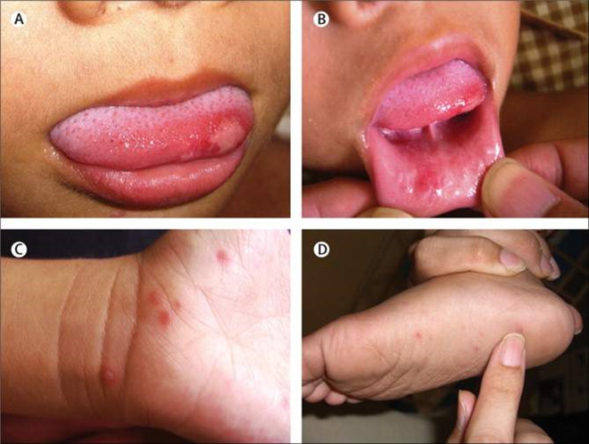 - Ban đầu sốt nhẹ, chán ăn, mệt mỏi, đau họng, nổi phỏng nước.