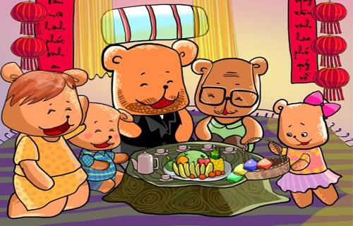 Gấu Con chỉ chờ có thế, vội bưng đĩa hoa quả bằng hai tay mời bố, mẹ, mời cả hai em nhỏ. Ơ kìa, thế phần của Gấu Con đâu? Nhìn Gấu Con lúng túng, Gấu Mẹ cũng phì cười, rồi hỏi: