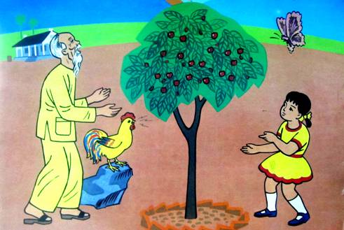 Ông trồng cây táo xuống đất. Bé tưới nước cho cây. Mưa tưới nước cho cây. Ông mặt trời sưởi nắng cho cây.